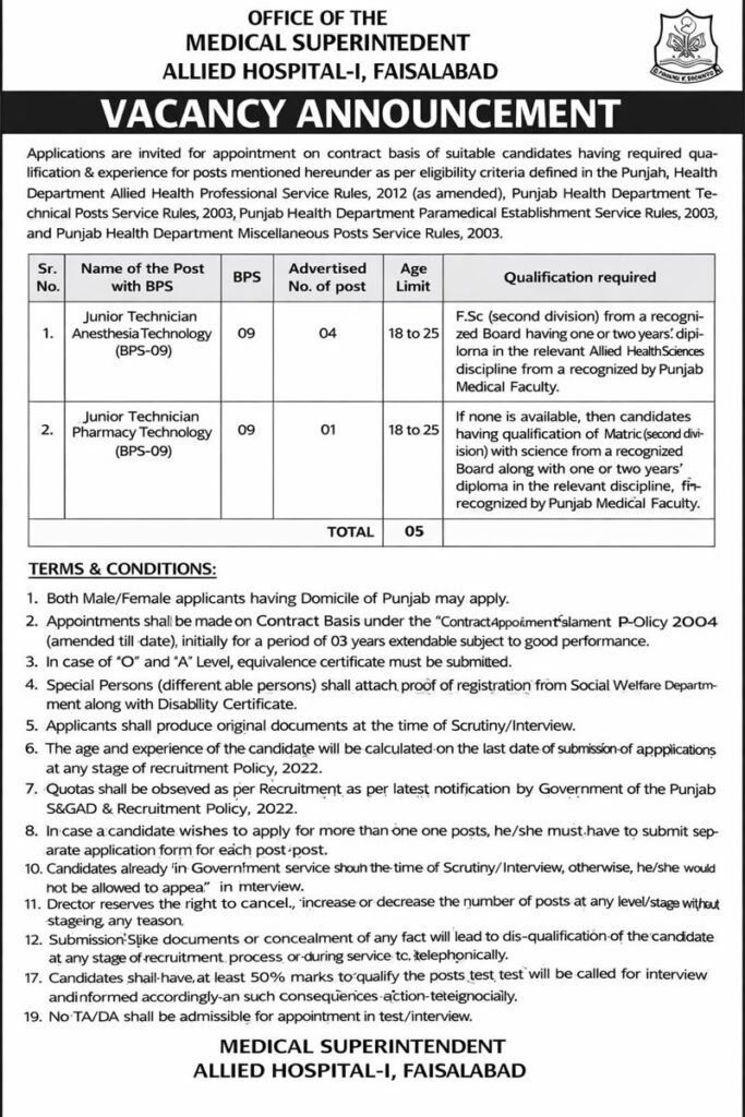 Contract-Based Junior Technician Vacancies at Allied Hospital Faisalabad