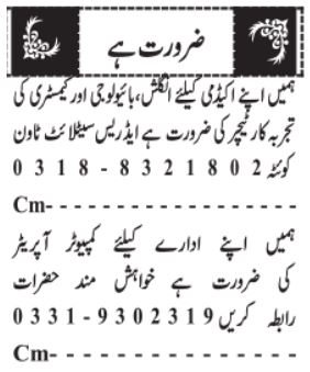 A private company in Satellite Town, Quetta has announced multiple full-time job openings for the positions of Biology Teacher, English Teacher, Chemistry Teacher, General Teacher, and Computer Operator. Candidates with qualifications ranging from Intermediate, BA, Bachelor, BS, or other relevant degrees are eligible to apply. These positions are offered on a full-time basis with attractive salary packages (salary will be decided according to qualification and experience). Interested applicants are advised to submit their CVs online before the closing date, which is 7 February 2026, or as mentioned in the newspaper advertisement published in Daily Jang.