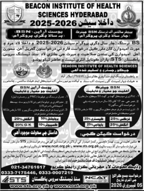 The Beacon Institute of Health Sciences Karachi has recently initiated admissions for BSN programs for students willing to enroll in a BSN degree in Sindh, Pakistan, during the academic year 2026. Interested students who meet the required standards can submit their admissions as per government policies. Admissions could be offered for both offline and online classes based on institute and government policies. For more information, one can check the newspaper advertisement that has been recently published.