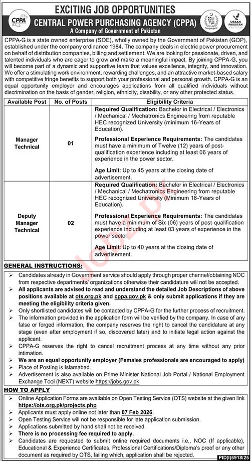The Central Power Purchasing Agency (CPPA-G), a government-owned organization of Pakistan, is inviting applications from motivated, skilled, and career-oriented professionals. CPPA-G plays a vital role in the country’s power sector by managing electricity procurement, billing, and settlement for distribution companies.This is a great opportunity for individuals who want to work in a professional, growth-focused, and supportive environment. CPPA-G offers a market-competitive salary, attractive benefits, and a workplace that values integrity, excellence, and innovation. The organization follows equal opportunity principles and encourages both male and female candidates to apply.Positions AvailableManager TechnicalDeputy Manager TechnicalSelected candidates will be appointed in Islamabad. Applicants must meet the required qualifications, relevant experience in the power sector, and age criteria mentioned for each post. Professionals currently working in government departments must apply through the proper channel with a valid NOC.Only shortlisted candidates will be contacted for further stages of recruitment. Providing incorrect or false information may result in disqualification at any stage. CPPA-G reserves the right to cancel or modify the recruitment process without prior notice.Last date to apply: 07 February 2026