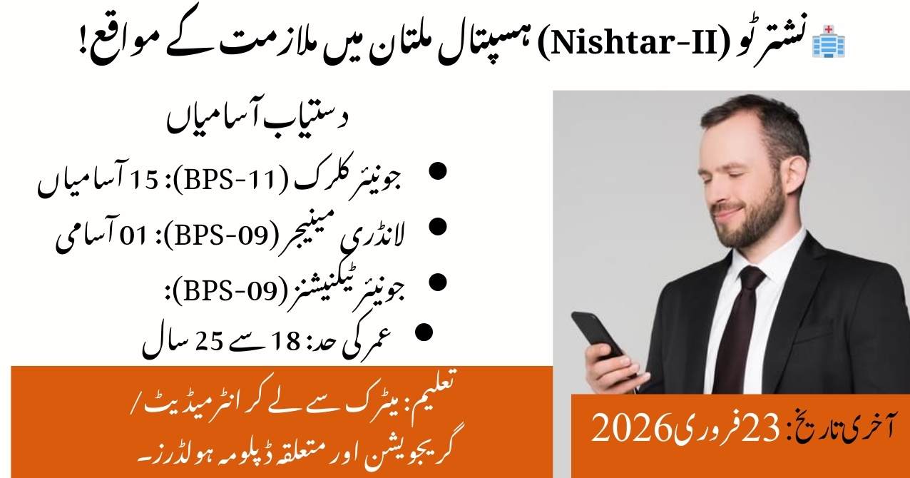 Nishtar-II Tertiary Care Hospital, Multan is hiring allied health, technical, and support staff on a contract basis. Appointments will be made under Punjab Health Department rules. This is a good opportunity for candidates seeking government hospital jobs.Vacancies include:Junior Clerk (BPS-11), Junior Technicians (Pathology, Cardiac, Pharmacy, Radiography, Surgical – BPS-9), Laundry Manager (BPS-9), Receptionist (BPS-6), AC Mechanic, Line Man, and Plumber (BPS-5).Eligibility:Relevant qualification/diploma for each post, age 18–25 years, Punjab domicile, and 50% passing marks in the written test.Contract: 3 years (extendable)Last Date to Apply: 23 February 2026Apply on time with complete documents.