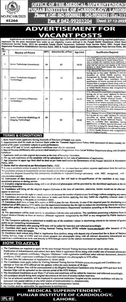 Punjab Institute of Cardiology (PIC), Lahore, a leading healthcare institution in Punjab, is inviting applications from eligible and motivated candidates for multiple Junior Technician positions on a contract basis (BPS-09). These opportunities are available in different technical disciplines, including Anesthesia, Surgical Technology, Pharmacy Technology, and Radiology & Imaging Technology.