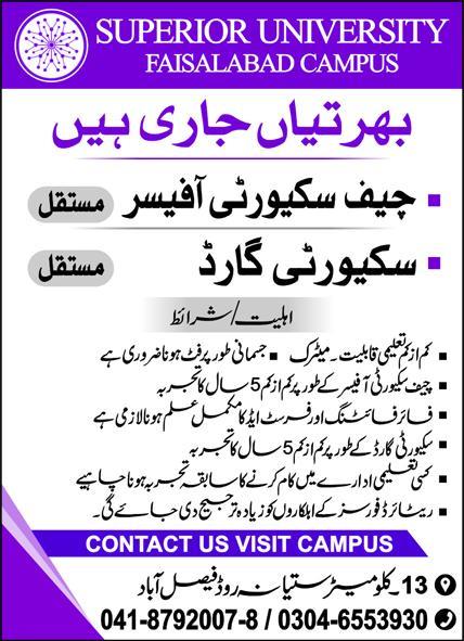 Superior University Faisalabad is hiring professional and reliable security staff for its campus on Satiana Road. This is an excellent opportunity for candidates looking to work in a secure and reputable academic environment.