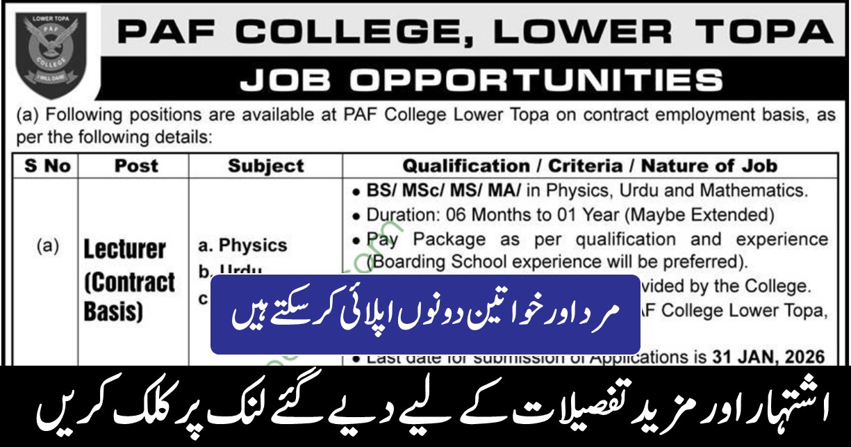 PAF College Lower Topa Lecturer Jobs – Jan 2026