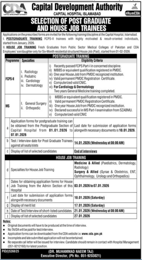 Those interested individuals can apply for the most recent Government Medical Internships/Trainee vacancies available at the Capital Development Authority (CDA). The last date for application is expected to be January 10, 2026, or as published in the advertisement in the newspaper. For more information in relation to the criteria for eligibility and the application process, you can find the full advertisement online.