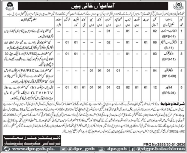 The Electricity Department Balochistan has recently announced new government jobs in Quetta, Balochistan, Pakistan. The available jobs include Account Assistant, Electric Sub Inspector, Clerk, Electrician, and Driver. Candidates can search and apply online for the latest jobs in the Electricity Department. This job posting was published on 31st January 2026 in the Jang newspaper. The last date for applying for these jobs is 02nd March 2026.