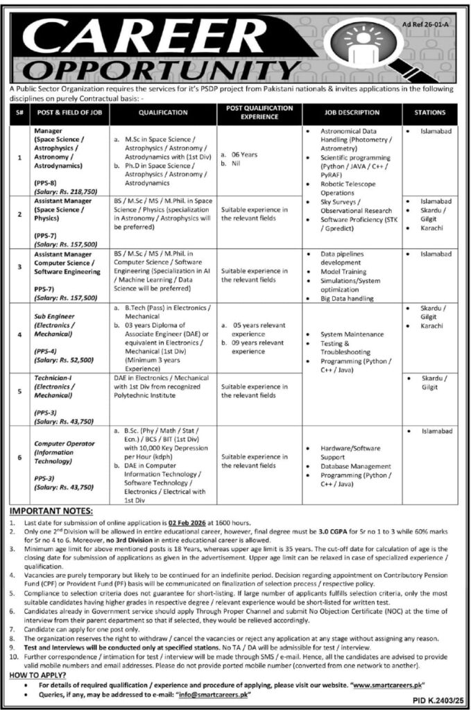 A well-reputed public sector organization is inviting applications from talented and motivated Pakistani nationals for multiple technical and managerial positions. These roles are offered on a contractual basis under a prestigious development project and provide an excellent chance to work in a professional, growth-oriented environment.Candidates with backgrounds in space science, physics, computer science, engineering, IT, and related technical fields are encouraged to apply. The organization offers attractive monthly salaries, exposure to advanced technology, and opportunities to work at different stations including Islamabad, Karachi, Skardu, and Gilgit.If you are looking for a respectable government-sector role, competitive pay, and a chance to enhance your professional skills, this is an opportunity you shouldn’t miss.Apply before the deadline and take the next step toward a strong and rewarding career.