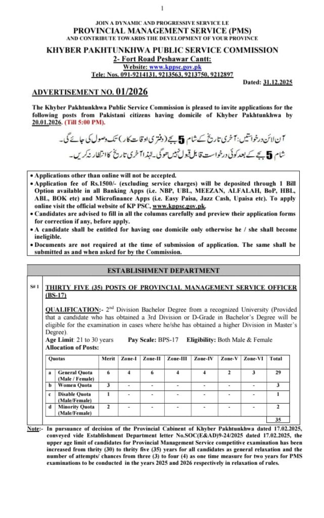 The Khyber Pakhtunkhwa Public Service Commission (KPPSC) is looking for talented individuals with a Khyber Pakhtunkhwa domicile to join the Provincial Management Service (PMS) as officers (BS‑17). This is your chance to secure a prestigious government job and contribute to the development of your province.Available Positions:PMS Officers (BS‑17) – 35 postsEligibility: Bachelor’s degree (2nd division minimum; 3rd division allowed if Master’s is higher division)Age Limit: 21–30 years (relaxable up to 35 for PMS exam)Pay Scale: BPS‑17 with attractive benefitsWhy This Job is Great:Prestigious and respected government careerEqual opportunity for male and female candidatesQuotas for women, minorities, and disabled candidatesCompetitive pay with allowances and career growth opportunitiesApplication Details:Apply online onlyApplication fee: Rs. 1,500 via banks or microfinance appsDeadline: 20th January 2026, 5:00 PMOnly candidates with a single KP domicile are eligibleTake this opportunity to secure your future with a rewarding government career. Apply before 20th January 2026 and step into a path of growth, stability, and respect!