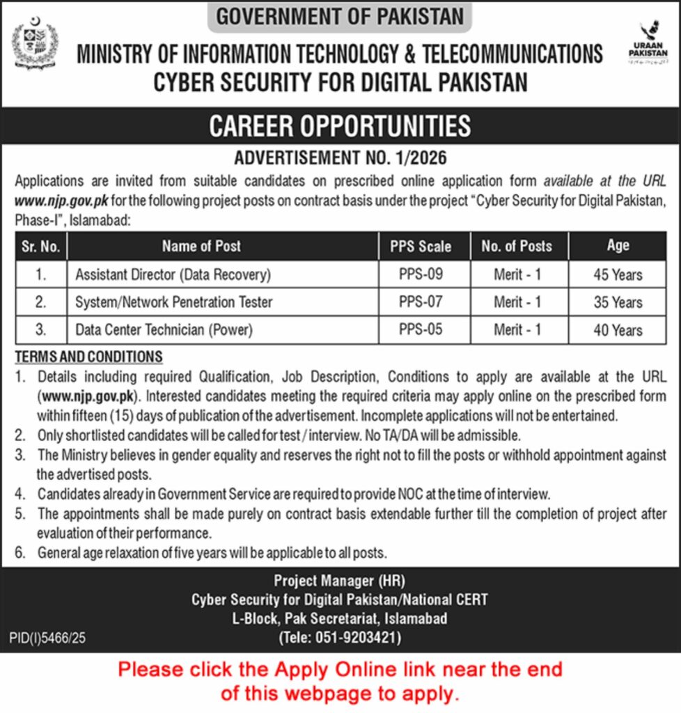 The Ministry of Information Technology & Telecommunications is offering exciting contract-based positions under the “Cyber Security for Digital Pakistan” project. If you want to work on cutting-edge cybersecurity initiatives, this is your opportunity!Available Positions:Assistant Director (Data Recovery)Grade: PPS‑09Vacancies: 1 (Merit)Maximum Age: 45 yearsSystem/Network Penetration TesterGrade: PPS‑07Vacancies: 1 (Merit)Maximum Age: 35 yearsData Center Technician (Power)Grade: PPS‑05Vacancies: 1 (Merit)Maximum Age: 40 yearsImportant Details:Check the official advertisement for required qualifications and job responsibilities.Apply online within 15 days of the advertisement’s release. Incomplete applications won’t be accepted.Only shortlisted candidates will be called for tests or interviews. No TA/DA will be provided.Equal opportunity for all genders is ensured; positions may remain unfilled if no suitable candidates are found.Government employees must submit a No Objection Certificate (NOC) at the time of interview.Appointments are on a contract basis, extendable based on performance.5-year age relaxation is applicable to all posts.📌 Don’t miss this chance – apply online now!