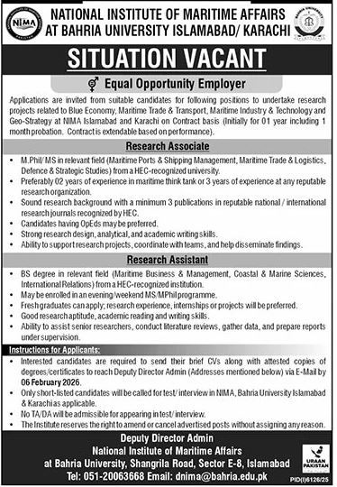 The National Institute of Maritime Affairs, Islamabad, has announced new job openings for Research Associate and Research Assistant. These government education jobs in Islamabad provide an excellent opportunity to enhance your career. Apply online for the latest job openings as advertised on 26 January 2026 in The News. The last date to apply for these jobs is 06 February 2026.