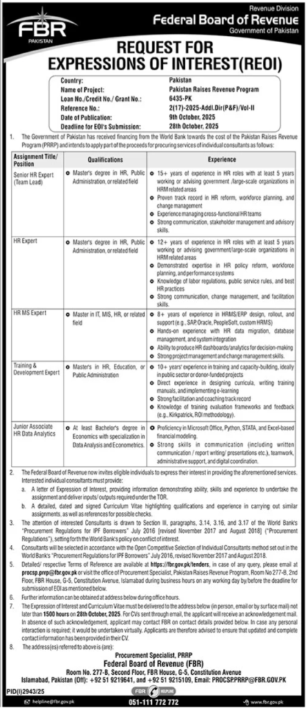 Interested applicants must submit their applications online before the announced closing date. Late or incomplete applications will not be entertained. Jobs offered under FBR Pakistan Raises Revenue Program Islamabad Jobs 2025 provide competitive salary packages, contractual benefits, professional work experience, and exposure to national-level revenue operations.