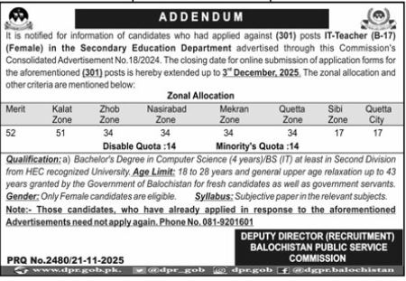 Latest BPSC Balochistan Public Service Commission Education Posts Quetta 2025: BPSC IT Teacher