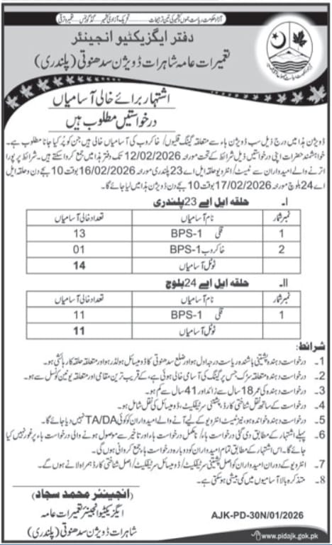 The Public Works Department (PWD), AJK is hiring daily-wage laborers for Helle-23 and Helle-24. These are BPS-1 contract positions for 3 years (extendable).Key Details:Posts: Helle-23: 27 | Helle-24: 22Age: 18–41 yearsEducation: Minimum primary passSelection: Written test + interview (50% marks to qualify)Documents: CNIC, certificates, 4 photosApplication: 12–23 Feb 2026Note: Training provided; no TA/DA for test or interview; quotas for women, minorities, and disabled candidates apply.