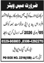 Find the latest job offers at Government Organization Islamabad in 2026. There are vacancies available for mess waiter and waiter. Check out the latest government jobs in management and begin your new job today. Apply today via the job posting advertised on 27 January 2026 in Ausaf Newspaper. The closing date for applications is 5 February 2026.