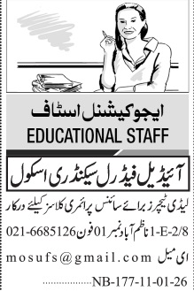 Ideal Grammar High School has recently posted ads for teaching vacancies in the Jang Sunday Classifieds as of January 11, 2026. Teaching vacancies include Teacher, Lady Teacher, Science Teacher, and Primary Teacher. These teaching vacancies are located in Karachi, Sindh, Pakistan. Teaching job seekers can apply for the above teaching vacancies advertised in the Jang newspaper as of January 12, 2026. The last date to apply for this job is January 27, 2026.
