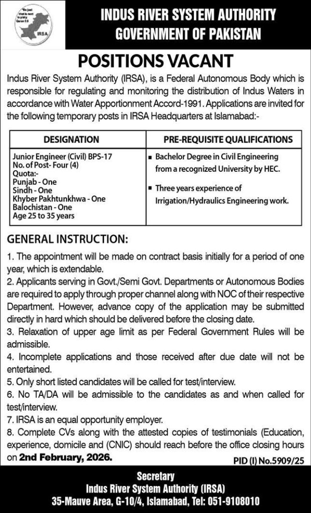 A job announcement has been made by the Indus River System Authority (IRSA) Islamabad regarding government engineering jobs available in Islamabad, Pakistan. The vacancy announced is for the post of Junior Engineer and Engineer. Applications are invited for the above-mentioned latest IRSA jobs, which are published in the Express Newspaper dated 19 January 2026. The closing date for application is 02 February 2026.