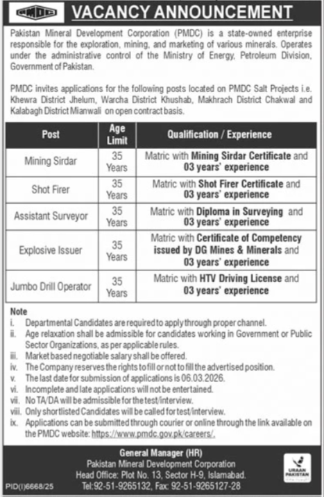Pakistan Mineral Development Corporation (PMDC), a state-owned organization under the Ministry of Energy (Petroleum Division), is seeking qualified and experienced candidates for various technical positions at its salt project sites in Khewra (Jhelum), Warcha (Khushab), Makhrach (Chakwal), and Kalabagh (Mianwali).Available Positions:Mining Sirdar – Matric with Mining Sirdar Certificate + 3 years’ experienceShot Firer – Matric with Shot Firer Certificate + 3 years’ experienceAssistant Surveyor – Matric with Diploma in Surveying + 3 years’ experienceExplosive Issuer – Matric with Certificate of Competency (DG Mines & Minerals) + 3 years’ experienceJumbo Drill Operator – Matric with HTV Driving License + 3 years’ experienceImportant Notes:Maximum age: 35 years (age relaxation for government/public sector employees as per rules)Applications must be complete; incomplete or late submissions will not be consideredSalaries are market-based and negotiableOnly shortlisted candidates will be called for test/interview; no TA/DA will be providedDepartmental candidates should apply through proper channelsDeadline for applications: 06 March 2026