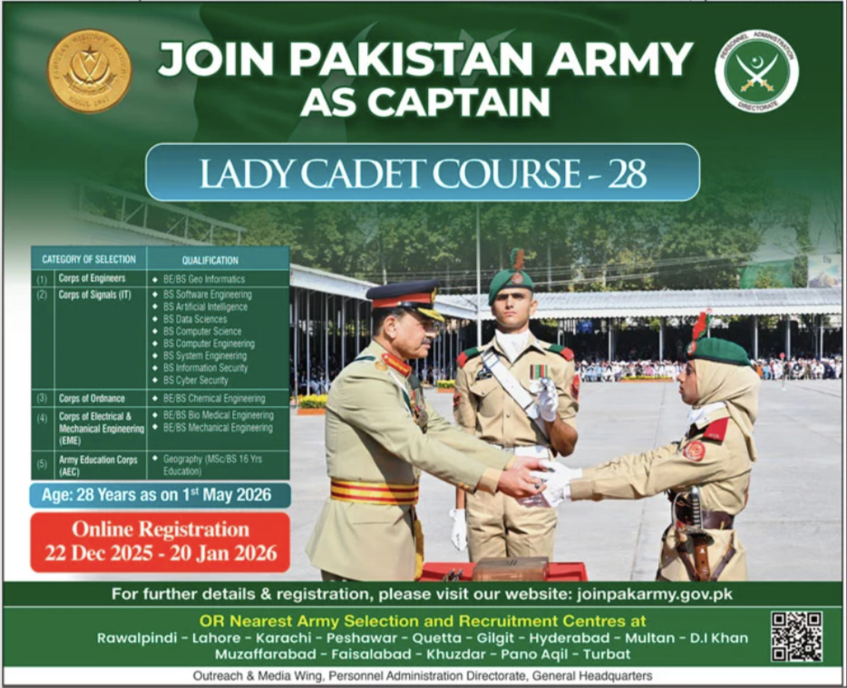 Applications are invited from the Pakistan Army as Lady Cadet for the posts of Lady Cadet Course published in the daily Jang Newspaper dated 21 December 2025. These vacancies are lying vacant in Multan, Muzaffarabad, Peshawar, Quetta, Islamabad, Karachi, and Gilgit.
