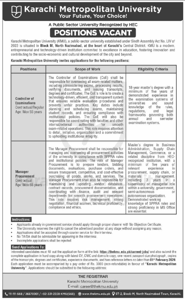 The recently announced Government Education Job Vacancies in Karachi, Sindh, Pakistan for 2026 at Karachi Metropolitan University (KMU) have been announced. The announced job positions are Controller of Examinations and Manager Procurement. Individuals interested in working with KMU have the option to search for online updates for the recently announced jobs. The recently announced jobs were advertised in the Dawn newspaper on 22 January 2026. The deadline for applying for these job positions is 01 February 2026.