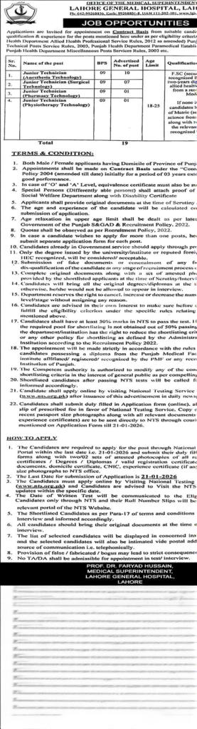 Lahore General Hospital (LGH) Lahore invites applications from eligible and motivated candidates for Junior Technician (BPS-09) positions on a contract basis. Both male and female applicants holding the required qualifications and relevant experience are encouraged to apply. These vacancies offer a stable career opportunity in the healthcare sector under a reputable government hospital.