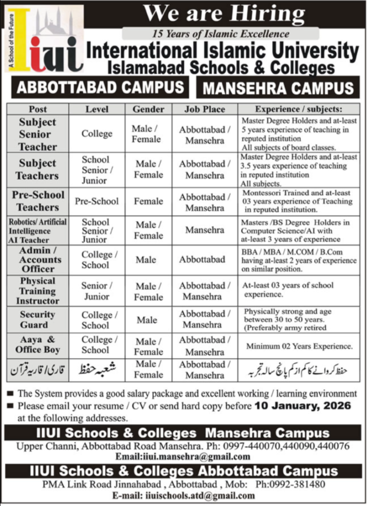 International Islamic University Islamabad School & Colleges have offered multiple job opportunities by issuing an advertisement on 6 January 2026 in daily Aja Newspaper. Location: Mansoura, Khyber Pakhtunkhwa (KPK), Pakistan