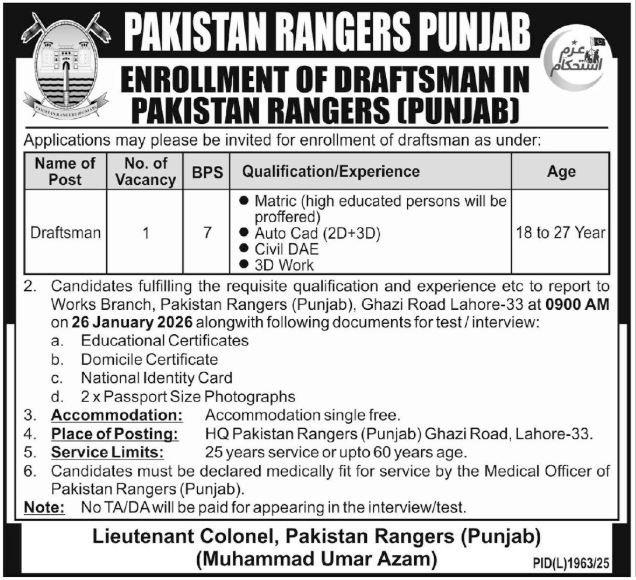 Pakistan Rangers, Headquarter Ghazi Road, Lahore invites applications for new management jobs for the posts of Draftsman, which is published in Daily Express Tribune dated 20 January 2026. Applications from individuals possessing Matric and equivalent qualification are invited. Note that the closing date for the following government and management positions at the Pakistan Rangers is likely to be 26 January 2026. You must confirm the exact date from the newspaper ad. Applicants are required to go through the entire online advertisement for eligibility criteria, application procedures, and other requirements of the job.