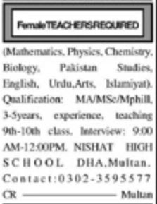 Nishat High School Multan has advertised the fresh recruitment for teaching staff for 2026. Appointments are requested for several teaching vacancies comprising Math Teachers, Physics Teachers, Chemistry Teachers, Biology Teachers, Pakistan Studies Teachers, English Teachers, Urdu Teachers, Arts Teachers, and Islamiyat Teachers. Vacancies are for Multan, Punjab, Pakistan. Interested applicants should apply for this advert that appeared in the Khabrain newspaper on 16th January 2026. The closing date for application is 31st January 2026. Begin your career in teaching. Apply online for the recent teaching vacancies at Nishat High School.