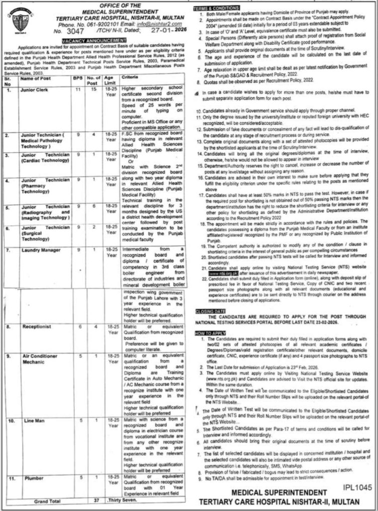 Tertiary Care Hospital Multan is inviting applications from eligible candidates for various government positions including Junior Technician, Junior Clerk, Receptionist, Lineman, Plumber, Air Conditioner Mechanic, and Laundry Manager. These full-time roles are based in Multan, Punjab, and are open to candidates with Middle, Matric, or Intermediate qualifications. Interested applicants are required to apply through NTS before the closing date of 23 February 2026 or as mentioned in the official newspaper advertisement. Candidates looking for secure government employment in a reputable healthcare institution are encouraged to apply within the given timeline.