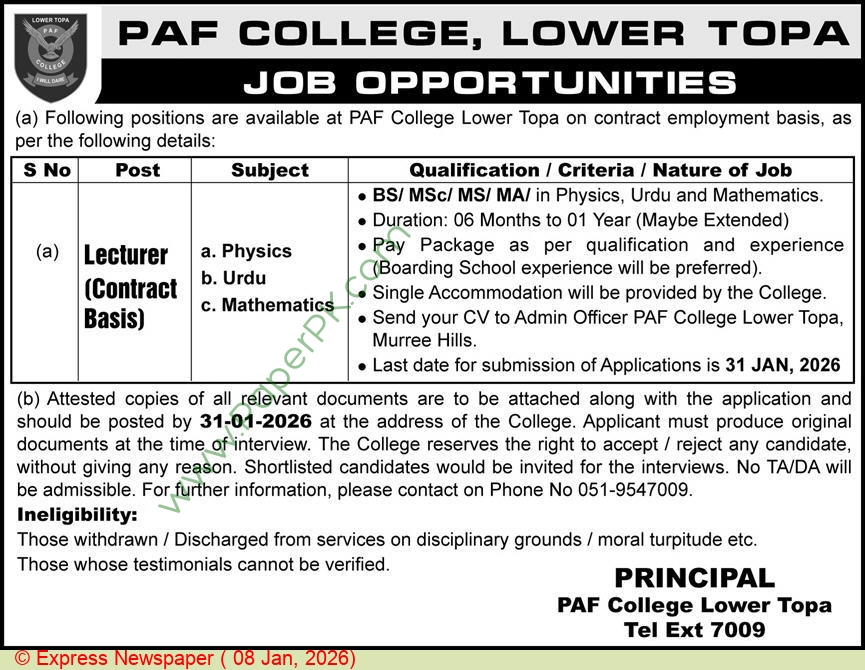 There are job opportunities for a lecturer at PAF College Lower Topa, which are announced in the newspaper on January 08, 2026. This is an advertisement with information regarding the availability of teaching staff. You can also search more job opportunities, jobs, and past advertisements on PaperPK.