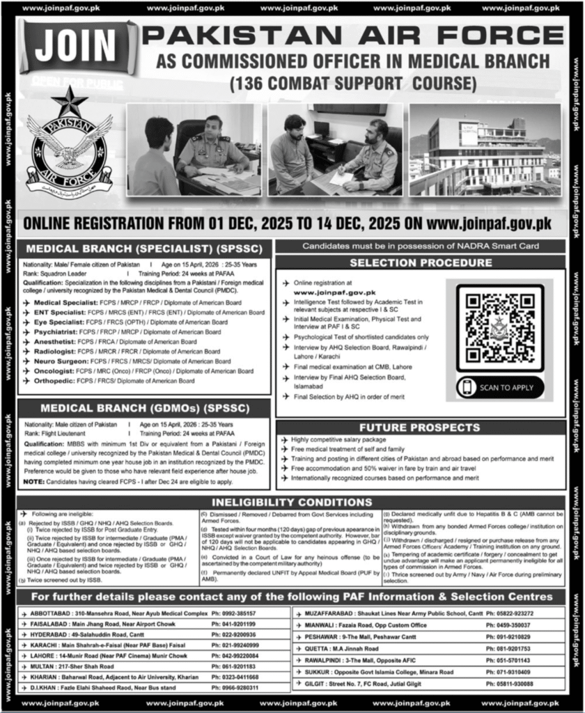 Applications are invited from eligible candidates for appointment against the posts of PAF Medical Branch Officer and Commissioned Officer PAF Jobs 2025 (Medical Branch) in the Pakistan Air Force, Islamabad, Multan, Karachi, Gilgit, Peshawar, Muzaffarabad, Bahawalpur, and Quetta. The Daily Ausaf, Islamabad has advertised on December 1st, 2025, for these posts. Preference will be given to the candidates possessing the MBBS degree.