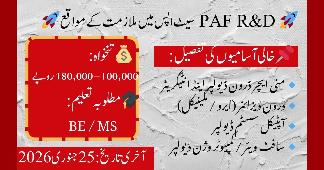 PAF R&D Setups invite skilled and enthusiastic professionals to become part of a dynamic research and development environment. These roles are focused on advanced technologies including drone systems, aerospace design, optical systems, software development, and computer vision. Candidates will get the chance to work on innovative projects, apply their technical expertise, and contribute to nationally important research initiatives. Applicants with relevant qualifications and practical experience will be given preference.Open Positions Include:Miniature Drone Developer & IntegratorDrone DesignerOptical System DeveloperSoftware / Computer Vision DeveloperTotal Vacancies: 07