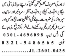 A reliable construction firm in Lahore is presenting a fresh jobs chance for professional applicants. Applications are required for the posts of Project Manager, Surveyor, and Site Supervisor. Such postings are a part of the latest construction jobs available in Lahore, Punjab, Pakistan. Candidates are encouraged to submit applications for the above construction firm jobs placed in the Jang newspaper on 16 January 2026. The final date to submit an application for the above jobs chance is 31st January 2026.