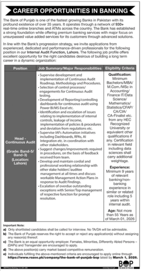 Bank of Punjab is looking for a highly experienced and motivated professional to join its team as Head – Continuous Audit based in Lahore. This senior role is suited for individuals who have strong expertise in internal audit and are eager to contribute to a progressive banking organization.The position involves leading and managing the Continuous Audit function, including designing audit roadmaps, methodologies, and control processes. The selected candidate will oversee audit testing, develop analytical dashboards and reports, identify control gaps, and ensure effective implementation of policies and regulatory requirements. The role also focuses on improving audit processes through automation, coordination with stakeholders, and timely escalation of audit issues to senior management.This opportunity offers a competitive, market-based remuneration package and a chance to grow professionally in a stable and well-established banking institution.