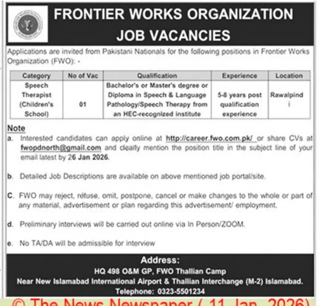 Frontier Works Organization FWO, a subsidiary of Pakistan Army is seeking applications for the posts of Speech Therapist in Islamabad. The advertisement for these vacancies has been published on January 11, 2026. Now, applications can be submitted for the most recent Speech Therapist jobs at Frontier Works Organization by PaperPK. Reference ID of job advertisement is 580683.
