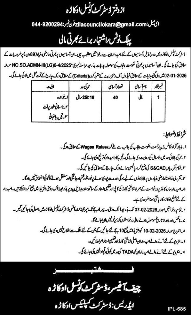 The District Council Okara is offering temporary job opportunities on a daily wages basis for suitable and hardworking male candidates. These positions are intended to support routine operations and will be filled according to the relevant government rules and approved criteria.There are 40 vacancies available. Applicants must be between 18 and 25 years of age and should meet the required basic qualifications for the post. Appointments will be made strictly on daily wages, and selected individuals will be paid according to the government-approved wage rates.Only eligible candidates who submit complete applications within the given timeframe will be considered. Shortlisted applicants will be informed about further steps in the selection process.
