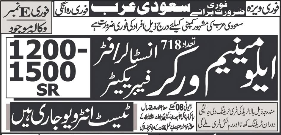 A prominent firm in Saudi Arabia is in urgent need of Aluminium Fabricators and Installers.