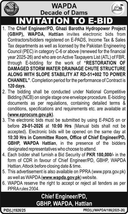 The Water and Power Development Authority (WAPDA) requires tenders for restoration in various equipment that have been damaged. The announcement has been made in accordance with the latest advertisement in the Daily Express in January 2026 in Lahore, Punjab, Pakistan.