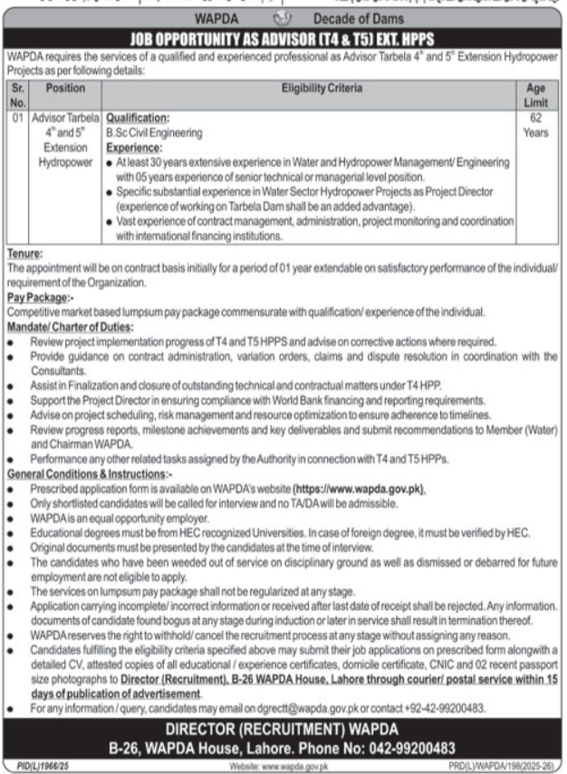 Water and Power Development Authority (WAPDA) has offered Advisor job openings for the year 2026. The managerial jobs in the Pakistan govt have been offered in Lahore, Punjab, Pakistan. The interested candidates are encouraged to apply for the recent WAPDA job opening online. This job posting is advertised in Ausaf Newspaper on 19 January 2026. The closing date for this job opening is 02 February 2026.