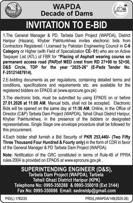 Water and Power Development Authority (WAPDA) has recently published tenders for 2026 on road and allied contracts. These tenders have been invited as per the advertisement published in the Daily Express Newspaper in January 2026. All interested companies and contractors from Karachi, Sindh, and Pakistan are requested to take part in these tender negotiations as per the terms and conditions advertised.